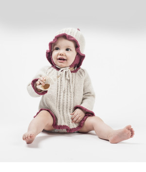 Þessi peysa er prjónuð úr mjög mjúkri ull sem heitir King baby Llama á prjóna nr. 3,5 og fæst í Rokku í Fjarðarkaupum. Þegar ég ákvað að hanna úr þessu bandi kom fyrst í hugann að gera flík þar sem bandið sjálft fengi að njóta sín. Held að það hafi tekist því mér finnst kaðlarnir njóta sín einkar vel þarna í mýktinni allri. Uppskriftin er í þremur stærðum, 9 mán, 1 1/2 árs og 2-3 ára. Kaðlarnir eru einfaldir tveggja lykkju kaðlar þar sem lykkja númer tvö á prjóninum er prjónuð á undan lykkju númer eitt, það þarf því ekki að nota kaðlaprjón.